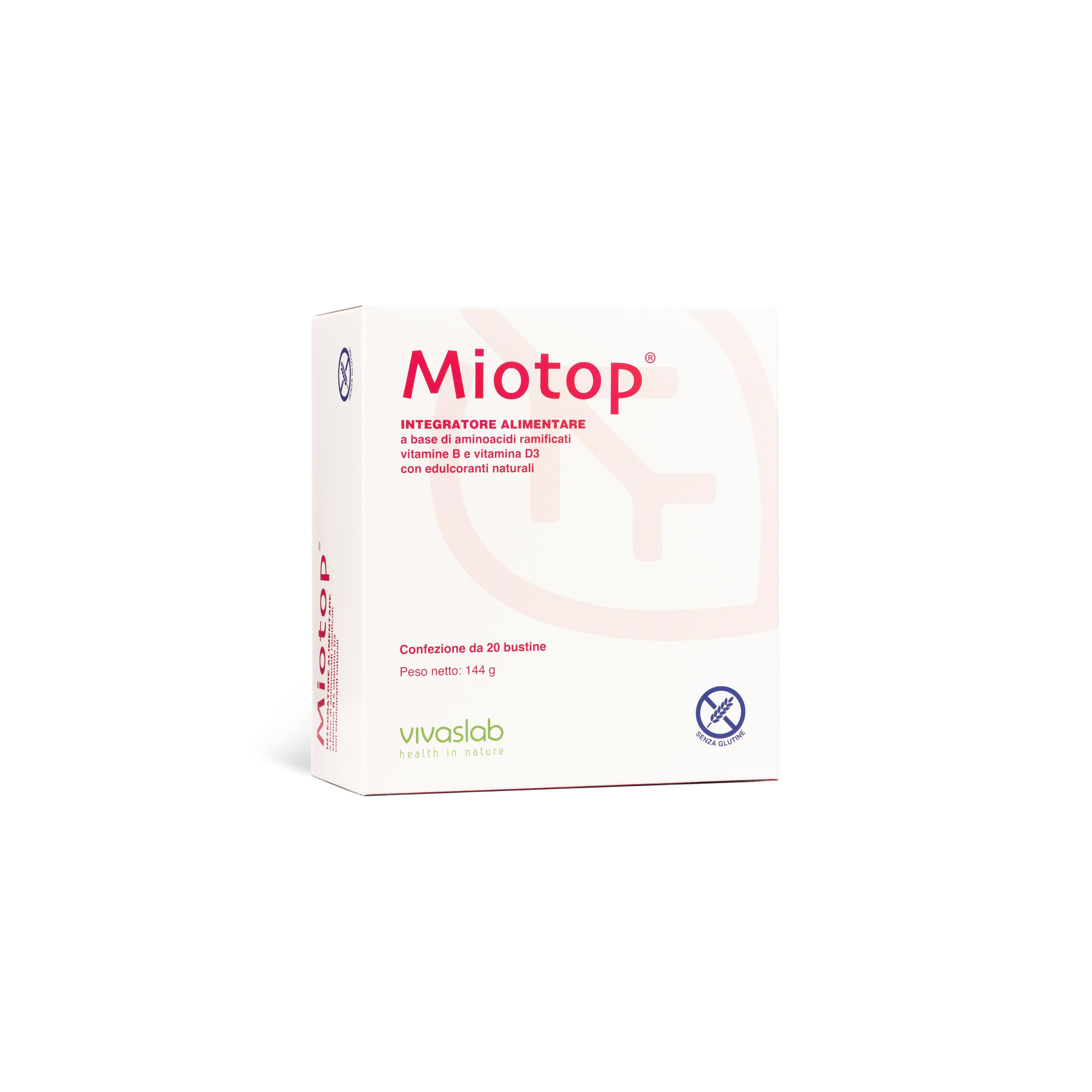 Miotop è una formulazione in bustine totalmente di origine vegetale utile negli stati di sofferenza muscolare come la sarcopenia, il post operatorio e le diete povere di proteine.